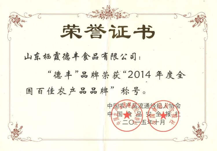 2014年度全國(guó)百?gòu)?qiáng)農(nóng)產(chǎn)品候選經(jīng)紀(jì)人、百佳農(nóng)產(chǎn)品候選品牌經(jīng)過各地農(nóng)產(chǎn)品經(jīng)紀(jì)人協(xié)會(huì)、供銷合作社,以及共青團(tuán)組織、婦聯(lián)等部門逐級(jí)推薦,評(píng)委會(huì)辦公室初審,9月12日評(píng)委審定會(huì)審定等程序產(chǎn)生,在2014年度的百佳農(nóng)產(chǎn)品品牌評(píng)選活動(dòng)中,棲霞德豐食品有限公司榮獲全國(guó)百佳農(nóng)產(chǎn)品品牌。