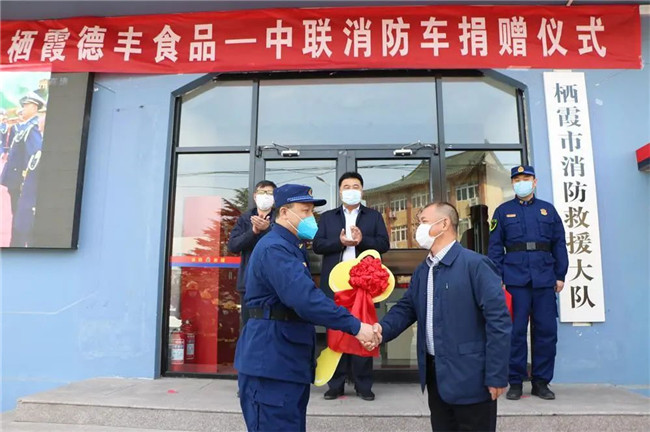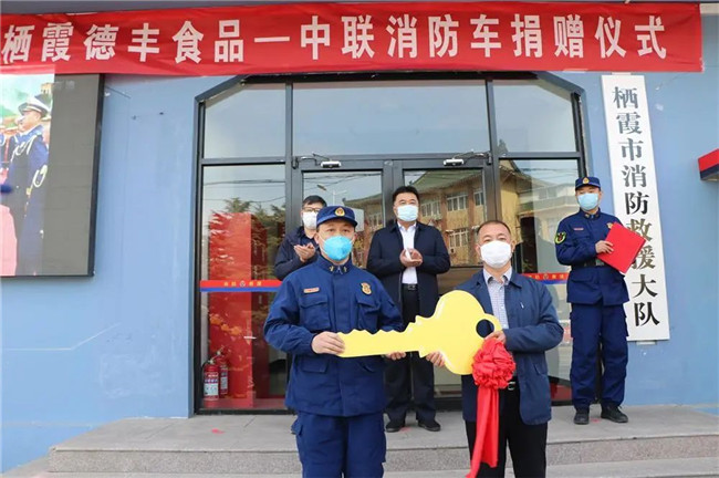 贈(zèng)車交接儀式上,棲霞德豐食品有限公司董事長潘德輝借交接儀式向全體消防員表達(dá)了關(guān)愛、感激、尊敬之情,并向大隊(duì)教導(dǎo)員成金峰贈(zèng)送了消防車鑰匙。