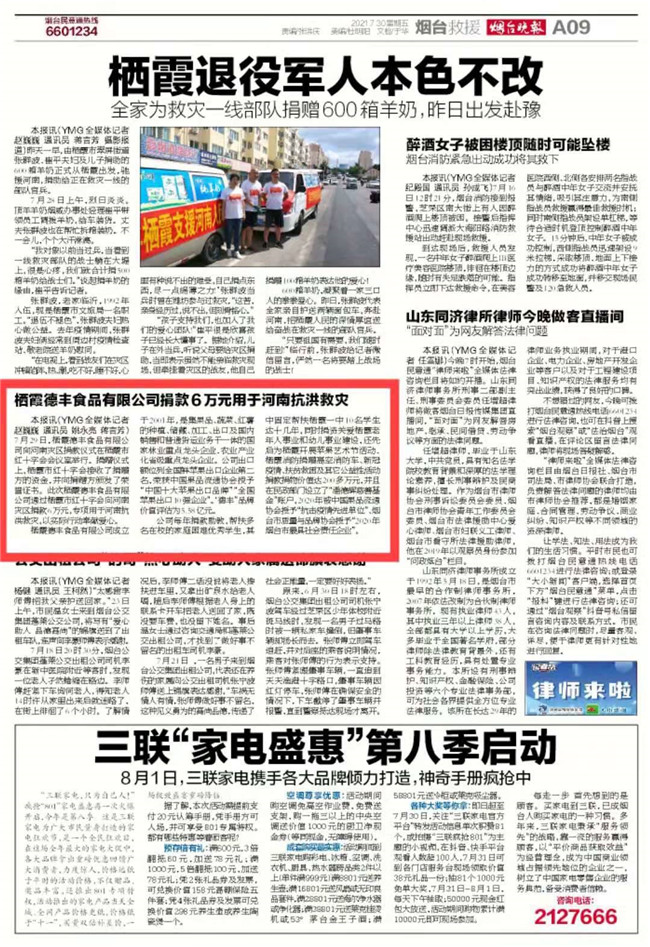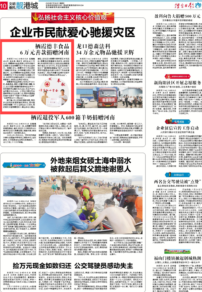 《煙臺(tái)日?qǐng)?bào)》《煙臺(tái)晚報(bào)》棲霞德豐捐款6萬(wàn)元用于河南抗洪救災(zāi)