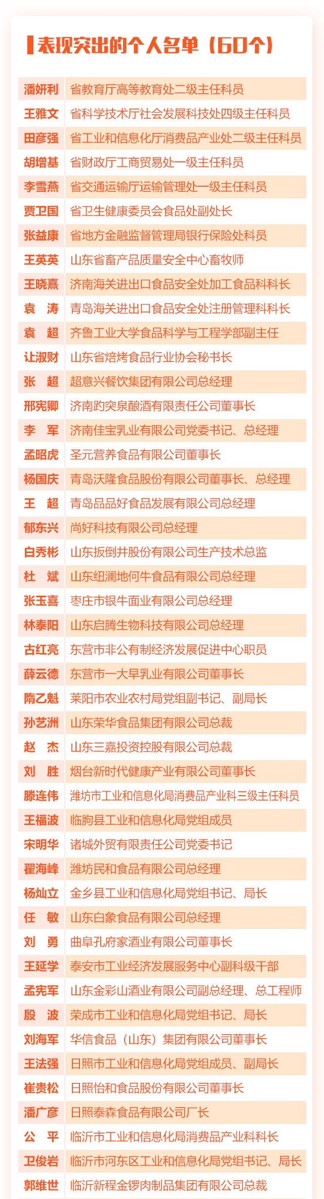 2022年,在以習(xí)近平同志為核心的黨中央堅(jiān)強(qiáng)領(lǐng)導(dǎo)下,全省各級各部門各單位和食品戰(zhàn)線廣大黨員干部職工堅(jiān)持以習(xí)近平新時(shí)代中國特色社會主義思想為指導(dǎo),深入學(xué)習(xí)貫徹黨的二十大精神,認(rèn)真落實(shí)習(xí)近平總書記對山東工作的重要指示要求,錨定“走在前、開新局”,團(tuán)結(jié)一心、攻堅(jiān)克難,全省食品產(chǎn)業(yè)持續(xù)提質(zhì)增效,涌現(xiàn)出了一批推動食品產(chǎn)業(yè)高質(zhì)量發(fā)展的先進(jìn)集體和個(gè)人。為充分發(fā)揮先進(jìn)示范帶動作用,省委、省政府決定,對省發(fā)展和改革委員會工業(yè)處等40個(gè)表現(xiàn)突出的集體、潘妍利等60名表現(xiàn)突出的個(gè)人予以通報(bào)表揚(yáng)。