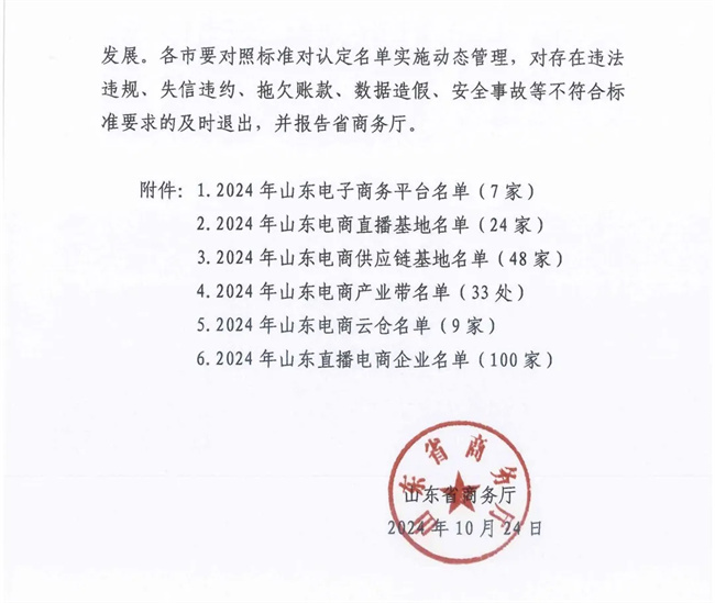 近日,省商務(wù)廳公布了2024年山東電子商務(wù)平臺名單(7家),山東電商直播基地名單(24家),山東電商供應(yīng)鏈基地名單(48家),山東電商產(chǎn)業(yè)帶名單(33處),山東電商云倉名單(9家),山東直播電商企業(yè)名單(100家)。棲霞德豐食品有限公司電商供應(yīng)鏈基地、煙臺果都電子商務(wù)有限公司電商供應(yīng)鏈基地成功入選山東電商供應(yīng)鏈基地,并納入山東省電商生態(tài)鏈企業(yè)“白名單”。?